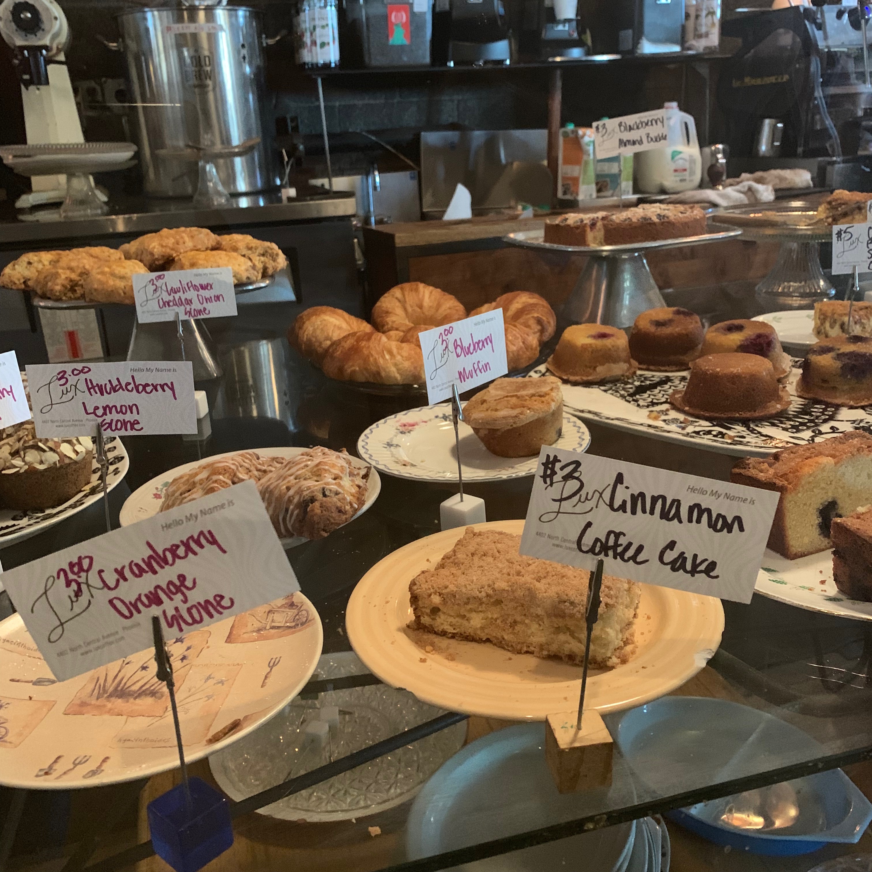 We waited in line about 12 minutes, with a Lux Central staff member walking down the line taking orders. Since I hadnāt been there before, I needed visuals and some direction. She allowed us to work our way up to the glass case where the pastries were on display. I made my order. Blueberry muffin and the pretty coffee drink in a glass mug. She asked, a latte? I said, yes, and what does it take to make it sweet? She said, caramel. I said yes, a caramel latte and a blueberry muffin, please.