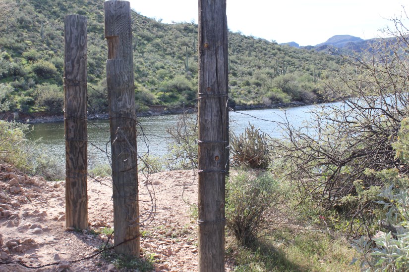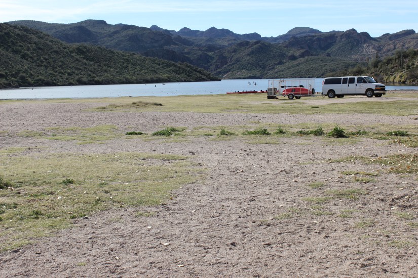 We fitted our water packs on our backs—pre-filled with chilled water bladders, protein bars, grapes, and hand sanitizer—and made our way through the bare recreational area near the lake. I took in the serene Saguaro Lake, then looked down at the ground beneath my feet: bare earth where grass once grew. This area hosts picnics, volleyball games, and serves as the launch point for fishermen entering the lake with their kayaks. The soil was packed hard, compacted by thousands of footsteps, coolers, and kayak launches.