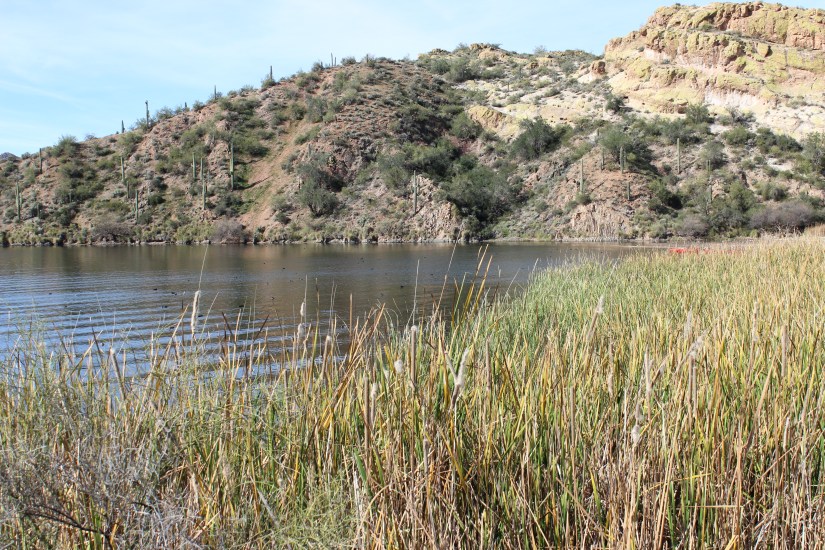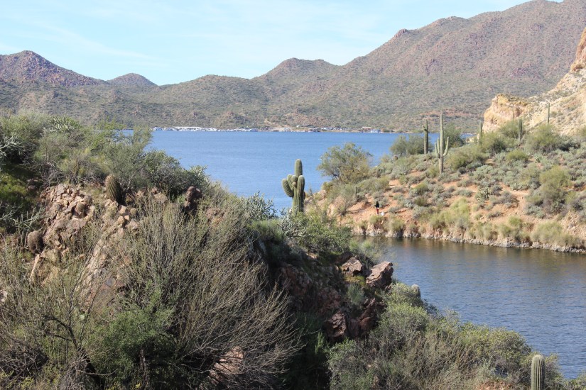 As the trail descended, it became very rocky—loose stones shifting underfoot, requiring careful placement of each step. But eventually it smoothed out as we headed back toward the ascent. I paused to witness Saguaro Lake from the opposite direction: beautiful and serene despite the busy day of traffic on the trail. The contrast was striking—nature’s quiet whisper alongside human activity.