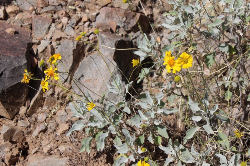 But then—a splash of color. Vibrant yellow flowers clustered along the trail’s edge, the only bright color in a brown and green desert palette. They seemed unbothered by the foot traffic, thriving in spaces where wildlife had retreated. Apparently, the animals had learned to avoid us, these wildflowers held their ground, blooming despite of.