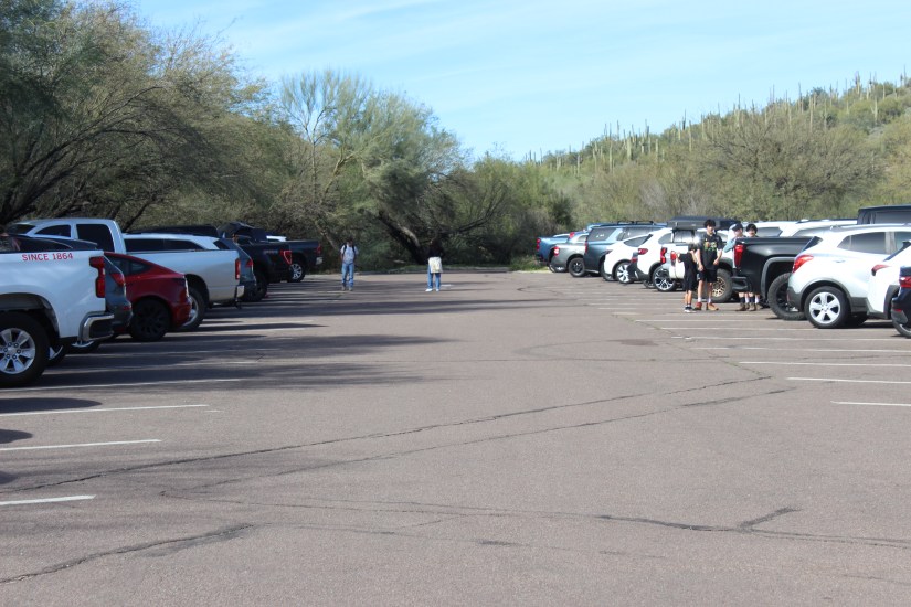 Arrived at Saguaro Canyon at 10 AM and the first thing you notice isn’t the trailhead—it’s the parking lot choreography. Vehicles circling like vultures, waiting for hikers to pack up and leave, drivers nudging into spaces as quickly as possible. We circled once before surrendering to the overflow lot we’d initially passed on the way in. Immediate evidence this trail is loved hard.