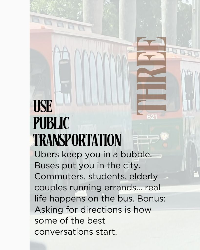 Renting a car or taking Ubers everywhere keeps you isolated from the actual city. Buses, trains, and trolleys? That’s where life happens.