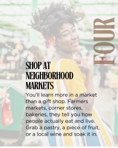 You don’t have to buy much — a piece of fruit, a fresh pastry, or a bottle of local wine. But you’ll learn more about a culture in 20 minutes in a market than an hour in a museum gift shop.
